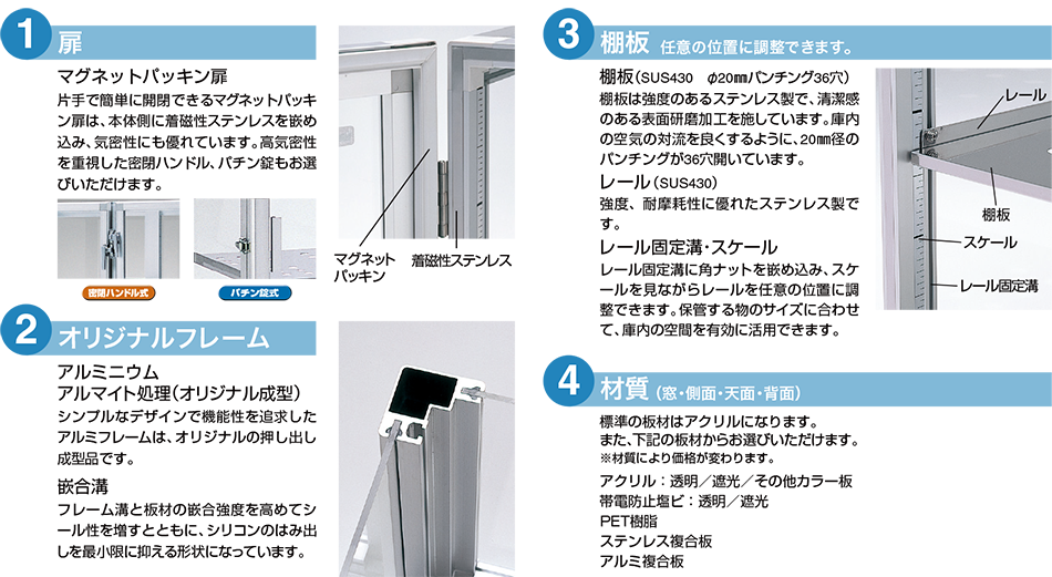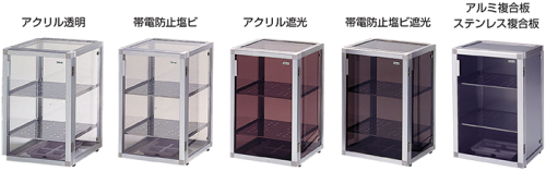 保管物や用途に合わせて、パネル材質を選択できます。アクリル:透明/遮光/その他カラー板