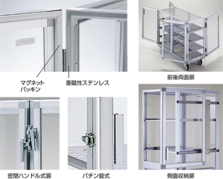 扉は開閉が簡単なマグネットパッキン式、高気密性を重視した密閉ハンドル式・パチン錠式からお選びいただけます。