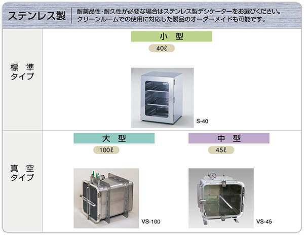 当社のデシケーターは除湿方式により「標準タイプ」「高機能除湿器タイプ」