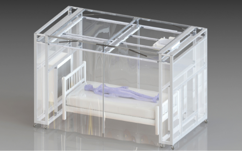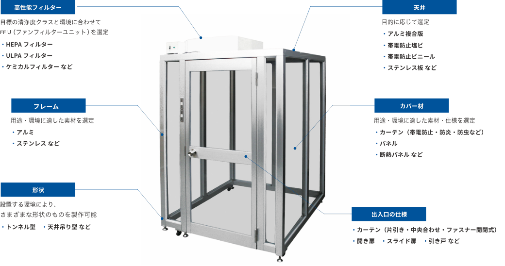 基本的には周囲壁と天井があり、天井には HEPA フィルターを搭載したクリーンモジュールユニットを設置し、クリーンエアーを天井から垂直層流することで局所空間をクリーン化させます。