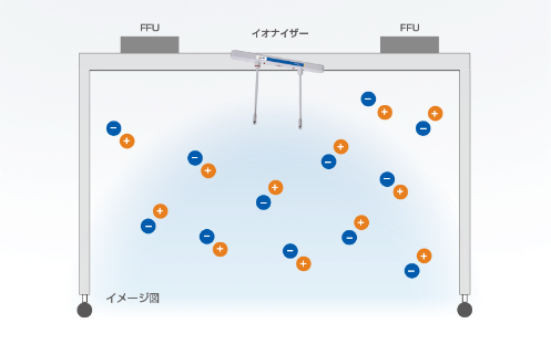 イオナイザーをブース内部の作業者や対象物の動線に設置して領域全体を除電します。