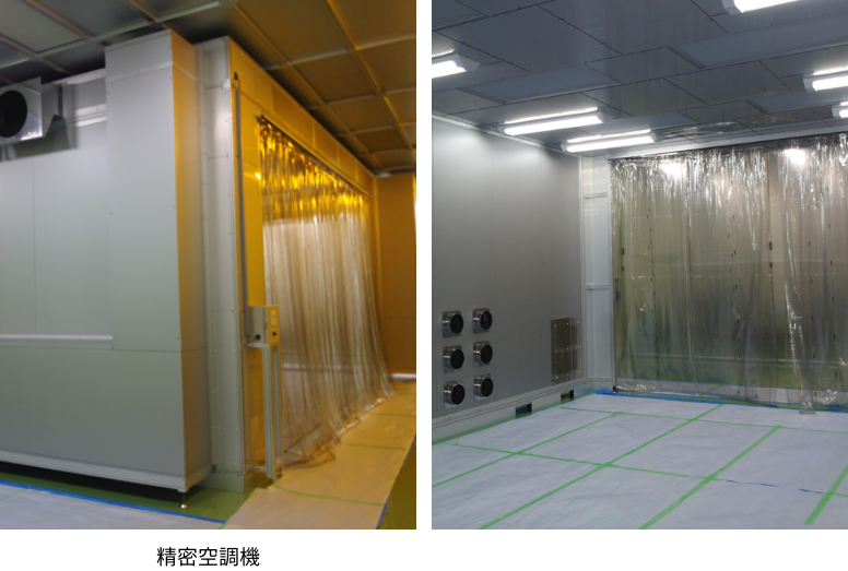 | 特長 | 既存建屋内に大型パネルクリーンブースを施工。 部屋のパーティションを有効活用し、天井を支える柱を排除して精密空調機を設置。 |