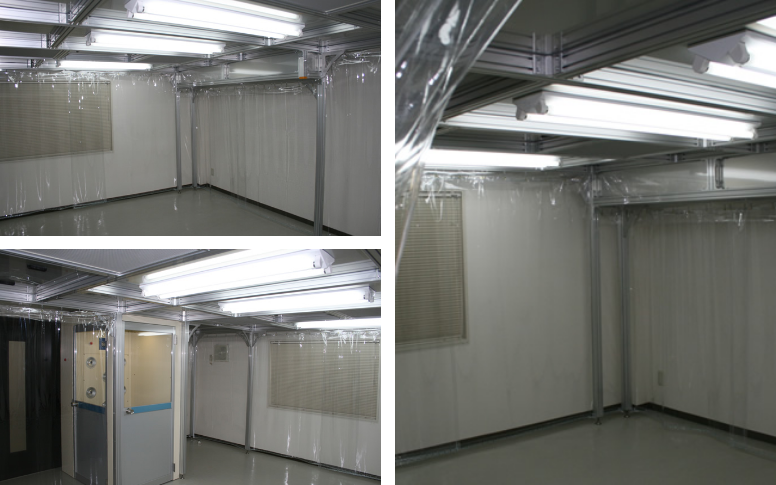 | 特長 | 既存の部屋を間仕切るパーティションを製作。 既存の空調機にHEPAフィルターを設置しブース内部をクリーン化。 |
