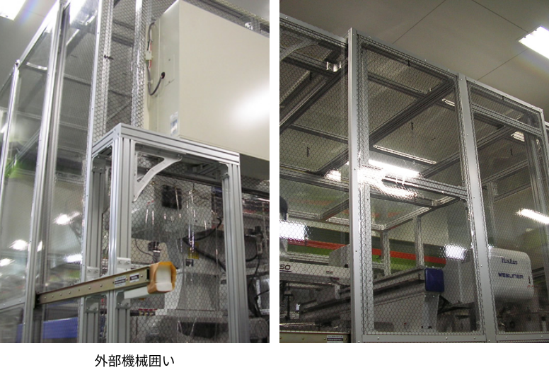 | 特長 | 成型機を囲い異物混入を防ぐクリーンブースを製作。 金型交換やメンテナンス時には前面~天井を囲う扉が左右に開く構造に。 |