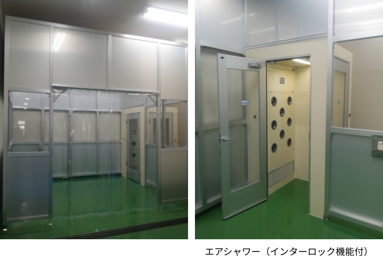 | 特長 | 前室で更衣し、エアーシャワーを通り入室。 大きな機械類を出し入れできるようにマシーンハッチを設置。 |