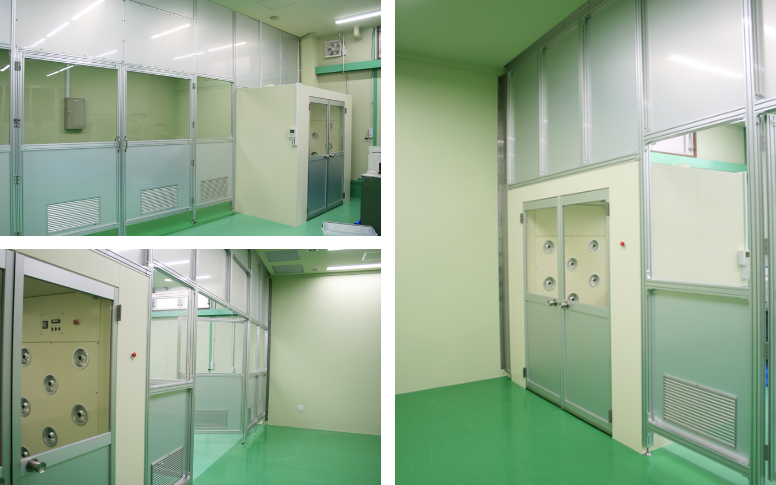 | 特長 | 既存の部屋を間仕切るパーティションを製作。 既存の空調機にHEPAフィルターを設置しルーム内部をクリーン化。 |